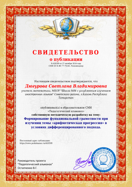 Дюгурова Светлана Владимировна Формирование функциональной грамотности при изучении темы «арифметическая прогрессия» в условиях дифференцированного подхода. / С. В. Дюгурова. – Текст : электронный // Педагогический альманах : электронное СМИ. - URL: https://www.pedalmanac.ru/420599. - Дата публикации: 27 октября 2024.