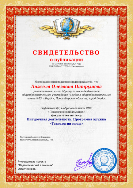Анжела Олеговна Патрушева Внеурочная деятельность. Программа кружка “Технологии моды” / О. П. Анжела. – Текст : электронный // Педагогический альманах : электронное СМИ. - URL: https://www.pedalmanac.ru/423788. - Дата публикации: 4 ноября 2024.