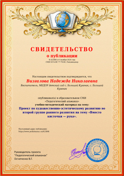 Визгалова, Н. Н. Проект по художественно-эстетическому развитию во второй группе раннего развития на тему «Вместо кисточки – рука». [Электронный ресурс] / Надежда Николаевна Визгалова // Педагогический альманах : [сайт]. - 2024. - 4 ноября. - [Россия]. - Режим доступа: https://www.pedalmanac.ru/423846, свободный. - Загл. с экрана.