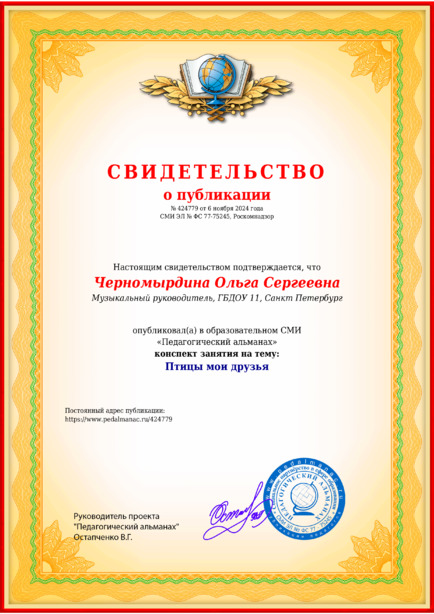 Черномырдина Ольга Сергеевна Птицы мои друзья / О. С. Черномырдина. – Текст : электронный // Педагогический альманах : электронное СМИ. - URL: https://www.pedalmanac.ru/424779. - Дата публикации: 6 ноября 2024.