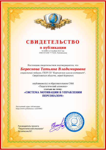 Береснева Татьяна Владимировна «СИСТЕМА МОТИВАЦИИ В УПРАВЛЕНИИ ПЕРСОНАЛОМ» / Т. В. Береснева. – Текст : электронный // Педагогический альманах : электронное СМИ. - URL: https://www.pedalmanac.ru/424963. - Дата публикации: 6 ноября 2024.