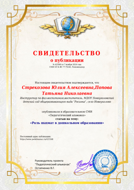 Стрекозова Юлия Алексеевна,Попова Татьяна Николаевна “Роль шахмат в дошкольном образовании” / Ю. А. Стрекозова. – Текст : электронный // Педагогический альманах : электронное СМИ. - URL: https://www.pedalmanac.ru/425568. - Дата публикации: 7 ноября 2024.