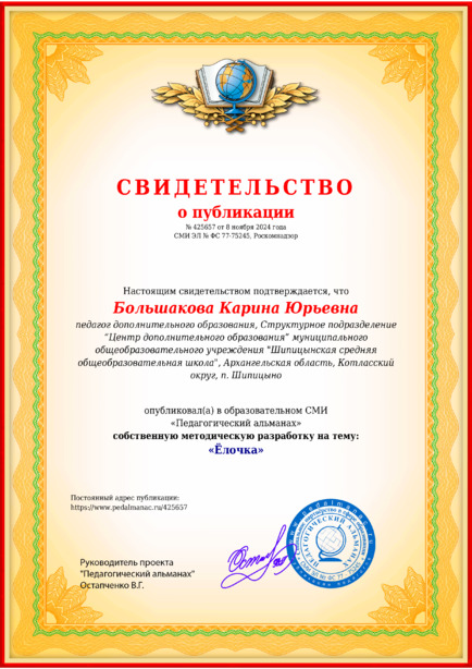 Большакова Карина Юрьевна “Ёлочка” / К. Ю. Большакова. – Текст : электронный // Педагогический альманах : электронное СМИ. - URL: https://www.pedalmanac.ru/425657. - Дата публикации: 8 ноября 2024.