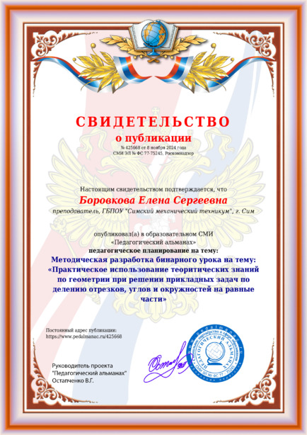 Боровкова Елена Сергеевна Методическая разработка бинарного урока на тему: «Практическое использование теоритических знаний по геометрии при решении прикладных задач по делению отрезков, углов и окружностей на равные части» / Е. С. Боровкова. – Текст : электронный // Педагогический альманах : электронное СМИ. - URL: https://www.pedalmanac.ru/425668. - Дата публикации: 8 ноября 2024.