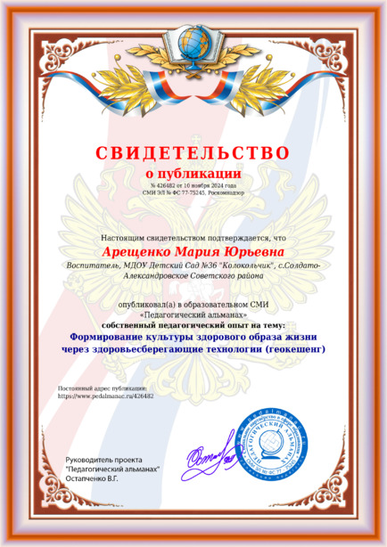 Арещенко Мария Юрьевна Формирование культуры здорового образа жизни через здоровьесберегающие технологии (геокешенг) / М. Ю. Арещенко. – Текст : электронный // Педагогический альманах : электронное СМИ. - URL: https://www.pedalmanac.ru/426482. - Дата публикации: 10 ноября 2024.