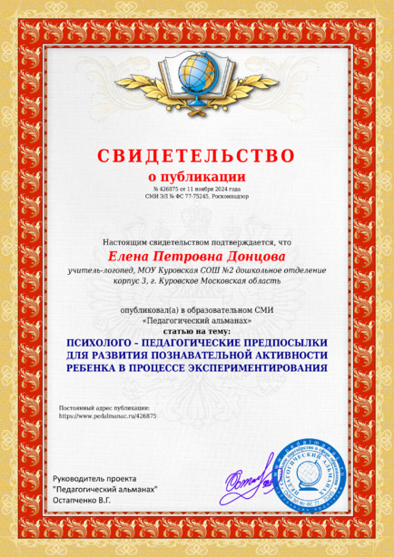 Елена Петровна Донцова ПСИХОЛОГО – ПЕДАГОГИЧЕСКИЕ ПРЕДПОСЫЛКИ ДЛЯ РАЗВИТИЯ ПОЗНАВАТЕЛЬНОЙ АКТИВНОСТИ РЕБЕНКА В ПРОЦЕССЕ ЭКСПЕРИМЕНТИРОВАНИЯ / П. Д. Елена. – Текст : электронный // Педагогический альманах : электронное СМИ. - URL: https://www.pedalmanac.ru/426875. - Дата публикации: 11 ноября 2024.
