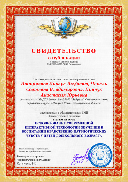 Иштрякова Линара Якубовна, Чепель Светлана Владимировна, Пинчук Анастасия Юрьевна ИСПОЛЬЗОВАНИЕ СОВРЕМЕННОЙ ИНТЕРАКТИВНОЙ ТЕХНОЛОГИИ ОБУЧЕНИЯ В ВОСПИТАНИИ НРАВСТВЕННО-ПАТРИОТИЧЕСКИХ ЧУВСТВ У ДЕТЕЙ ДОШКОЛЬНОГО ВОЗРАСТА / Л. Я. Иштрякова. – Текст : электронный // Педагогический альманах : электронное СМИ. - URL: https://www.pedalmanac.ru/426899. - Дата публикации: 11 ноября 2024.