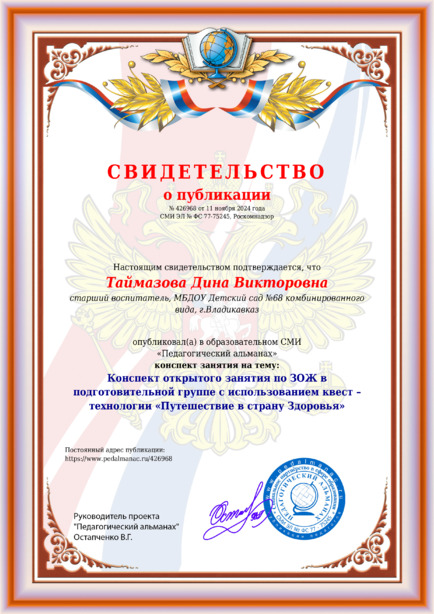 Таймазова Дина Викторовна Конспект открытого занятия по ЗОЖ в подготовительной группе с использованием квест – технологии «Путешествие в страну Здоровья» / Д. В. Таймазова. – Текст : электронный // Педагогический альманах : электронное СМИ. - URL: https://www.pedalmanac.ru/426968. - Дата публикации: 11 ноября 2024.