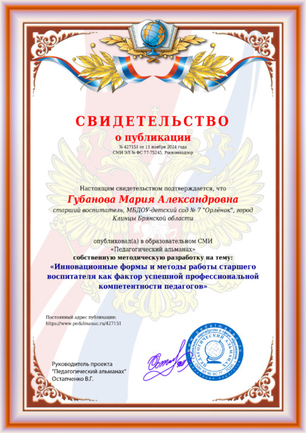 Губанова Мария Александровна «Инновационные формы и методы работы старшего воспитателя как фактор успешной профессиональной компетентности педагогов” / М. А. Губанова. – Текст : электронный // Педагогический альманах : электронное СМИ. - URL: https://www.pedalmanac.ru/427151. - Дата публикации: 11 ноября 2024.