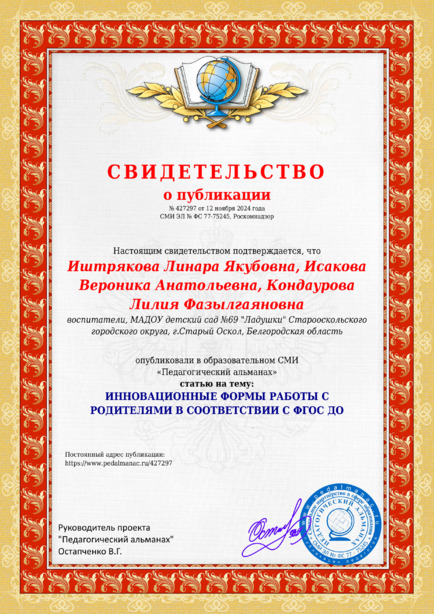 Иштрякова Линара Якубовна, Исакова Вероника Анатольевна, Кондаурова Лилия Фазылгаяновна ИННОВАЦИОННЫЕ ФОРМЫ РАБОТЫ С РОДИТЕЛЯМИ В СООТВЕТСТВИИ С ФГОС ДО / Л. Я. Иштрякова. – Текст : электронный // Педагогический альманах : электронное СМИ. - URL: https://www.pedalmanac.ru/427297. - Дата публикации: 12 ноября 2024.