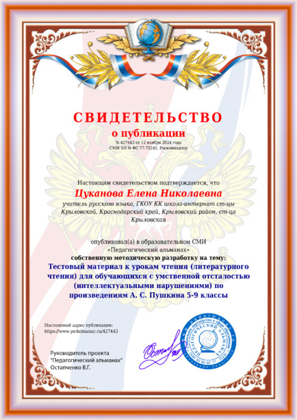 Цуканова Елена Николаевна Тестовый материал к урокам чтения (литературного чтения) для обучающихся с умственной отсталостью (интеллектуальными нарушениями) по произведениям А. С. Пушкина 5-9 классы / Е. Н. Цуканова. – Текст : электронный // Педагогический альманах : электронное СМИ. - URL: https://www.pedalmanac.ru/427443. - Дата публикации: 12 ноября 2024.