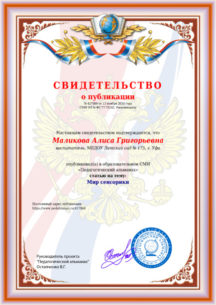 Маликова Алиса Григорьевна Мир сенсорики / А. Г. Маликова. – Текст : электронный // Педагогический альманах : электронное СМИ. - URL: https://www.pedalmanac.ru/427860. - Дата публикации: 13 ноября 2024.