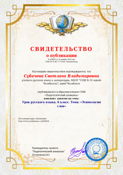 Субачева Светлана Владимировна Урок русского языка. 6 класс. Тема: «Этимология слов» / С. В. Субачева. – Текст : электронный // Педагогический альманах : электронное СМИ. - URL: https://www.pedalmanac.ru/428654. - Дата публикации: 16 ноября 2024.