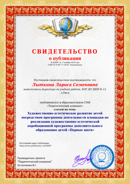 Лыткина Лариса Семеновна Художественно-эстетическое развитие детей посредством программы деятельности площадки по реализации художественно-эстетической апробационной программы дополнительного образования детей «Первые шаги» / Л. С. Лыткина. – Текст : электронный // Педагогический альманах : электронное СМИ. - URL: https://www.pedalmanac.ru/428967. - Дата публикации: 17 ноября 2024.