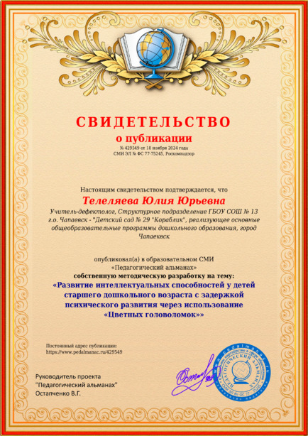 Телеляева Юлия Юрьевна “Развитие интеллектуальных способностей у детей старшего дошкольного возраста с задержкой психического развития через использование “Цветных головоломок”” / Ю. Ю. Телеляева. – Текст : электронный // Педагогический альманах : электронное СМИ. - URL: https://www.pedalmanac.ru/429549. - Дата публикации: 18 ноября 2024.