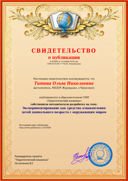 Титова, О. Н. Экспериментирование как средство ознакомления детей дошкольного возраста с окружающим миром [Электронный ресурс] / Ольга Николаевна Титова // Педагогический альманах : [сайт]. - 2024. - 18 ноября. - [Россия]. - Режим доступа: https://www.pedalmanac.ru/429606, свободный. - Загл. с экрана.