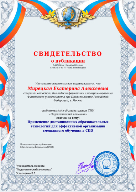 Мирецкая Екатерина Алексеевна Применение дистанционных образовательных технологий для эффективной организации смешанного обучения в СПО / Е. А. Мирецкая. – Текст : электронный // Педагогический альманах : электронное СМИ. - URL: https://www.pedalmanac.ru/429836. - Дата публикации: 19 ноября 2024.