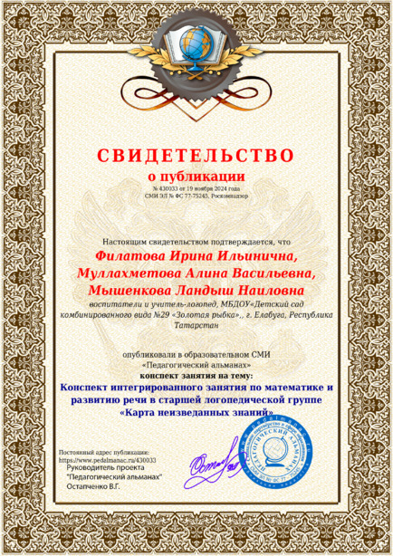 Филатова Ирина Ильинична, Муллахметова Алина Васильевна, Мышенкова Ландыш Наиловна Конспект интегрированного занятия по математике и развитию речи в старшей логопедической группе «Карта неизведанных знаний» / И. И. Филатова. – Текст : электронный // Педагогический альманах : электронное СМИ. - URL: https://www.pedalmanac.ru/430033. - Дата публикации: 19 ноября 2024.