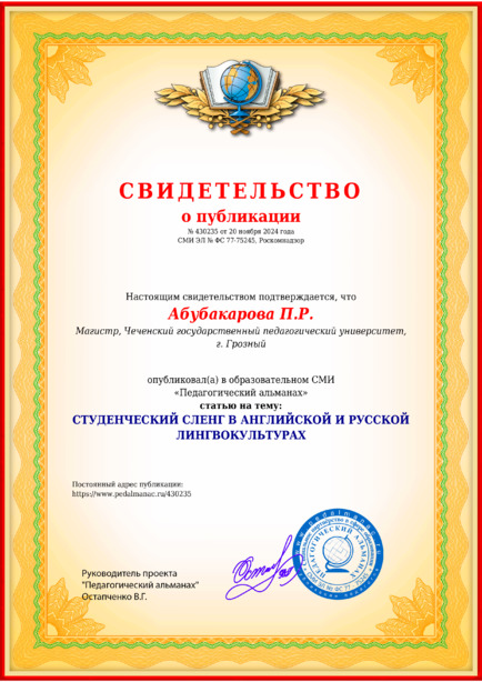 Абубакарова, П. СТУДЕНЧЕСКИЙ СЛЕНГ В АНГЛИЙСКОЙ И РУССКОЙ ЛИНГВОКУЛЬТУРАХ [Электронный ресурс] / П.Р. Абубакарова // Педагогический альманах : [сайт]. - 2024. - 20 ноября. - [Россия]. - Режим доступа: https://www.pedalmanac.ru/430235, свободный. - Загл. с экрана.