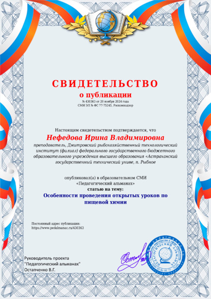Нефедова, И. В. Особенности проведения открытых уроков по пищевой химии [Электронный ресурс] / Ирина Владимировна Нефедова // Педагогический альманах : [сайт]. - 2024. - 20 ноября. - [Россия]. - Режим доступа: https://www.pedalmanac.ru/430363, свободный. - Загл. с экрана.