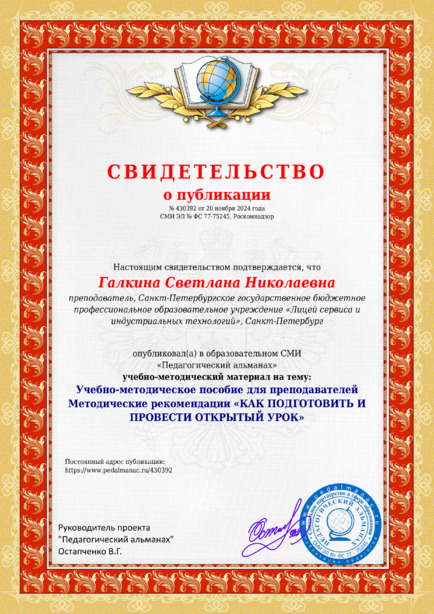 Галкина Светлана Николаевна Учебно-методическое пособие для преподавателей Методические рекомендации «КАК ПОДГОТОВИТЬ И ПРОВЕСТИ ОТКРЫТЫЙ УРОК» / С. Н. Галкина. – Текст : электронный // Педагогический альманах : электронное СМИ. - URL: https://www.pedalmanac.ru/430392. - Дата публикации: 20 ноября 2024.