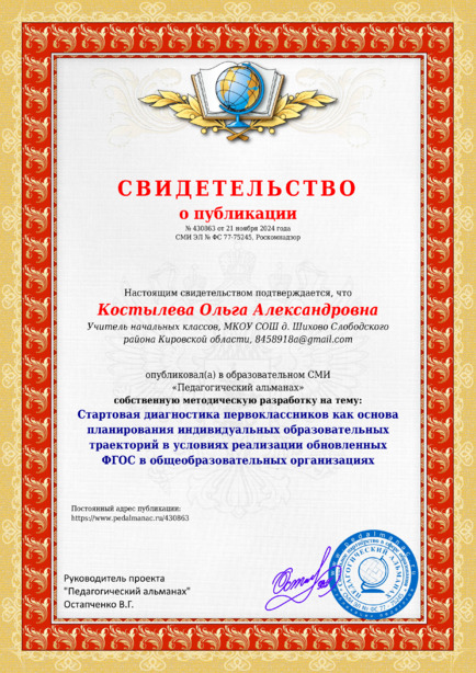 Костылева Ольга Александровна Стартовая диагностика первоклассников как основа планирования индивидуальных образовательных траекторий в условиях реализации обновленных ФГОС в общеобразовательных организациях / О. А. Костылева. – Текст : электронный // Педагогический альманах : электронное СМИ. - URL: https://www.pedalmanac.ru/430863. - Дата публикации: 21 ноября 2024.