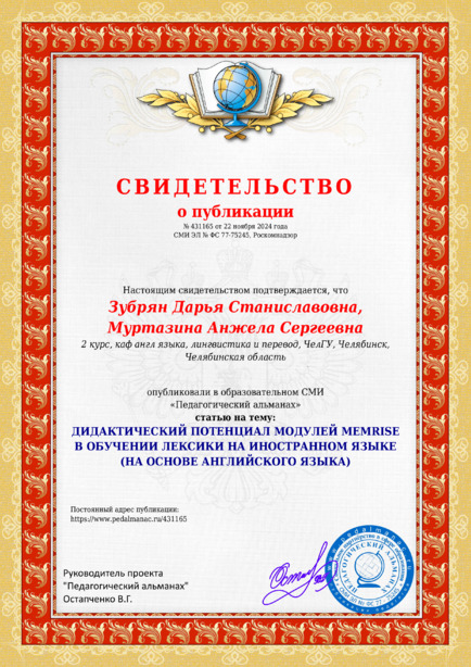 Зубрян Дарья Станиславовна, Муртазина Анжела Сергеевна ДИДАКТИЧЕСКИЙ ПОТЕНЦИАЛ МОДУЛЕЙ MEMRISE В ОБУЧЕНИИ ЛЕКСИКИ НА ИНОСТРАННОМ ЯЗЫКЕ (НА ОСНОВЕ АНГЛИЙСКОГО ЯЗЫКА) / Д. С. Зубрян. – Текст : электронный // Педагогический альманах : электронное СМИ. - URL: https://www.pedalmanac.ru/431165. - Дата публикации: 22 ноября 2024.