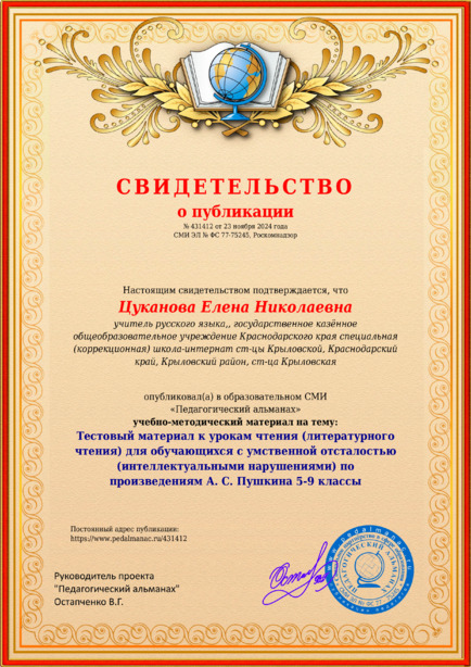 Цуканова Елена Николаевна Тестовый материал к урокам чтения (литературного чтения) для обучающихся с умственной отсталостью (интеллектуальными нарушениями) по произведениям А. С. Пушкина 5-9 классы / Е. Н. Цуканова. – Текст : электронный // Педагогический альманах : электронное СМИ. - URL: https://www.pedalmanac.ru/431412. - Дата публикации: 23 ноября 2024.