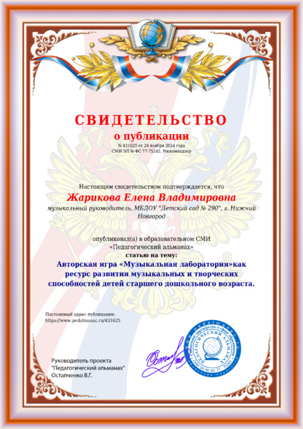 Жарикова Елена Владимировна Авторская игра “Музыкальная лаборатория”как ресурс развития музыкальных и творческих способностей детей старшего дошкольного возраста. / Е. В. Жарикова. – Текст : электронный // Педагогический альманах : электронное СМИ. - URL: https://www.pedalmanac.ru/431625. - Дата публикации: 24 ноября 2024.