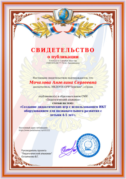 Мочалова Ангелина Сергеевна «Создание дидактических игр с использованием ИКТ оборудованием для познавательного развития с детьми 4-5 лет». / А. С. Мочалова. – Текст : электронный // Педагогический альманах : электронное СМИ. - URL: https://www.pedalmanac.ru/435222. - Дата публикации: 3 декабря 2024.