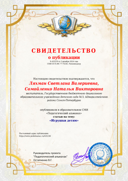 Ляхман Светлана Валериевна, Сомойленко Наталья Викторовна “Игрушки детям” / С. В. Ляхман. – Текст : электронный // Педагогический альманах : электронное СМИ. - URL: https://www.pedalmanac.ru/435230. - Дата публикации: 3 декабря 2024.