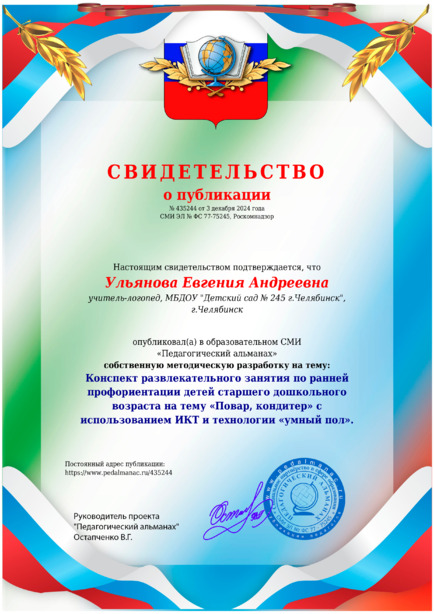 Ульянова Евгения Андреевна Конспект развлекательного занятия по ранней профориентации детей старшего дошкольного возраста на тему «Повар, кондитер» с использованием ИКТ и технологии «умный пол». / Е. А. Ульянова. – Текст : электронный // Педагогический альманах : электронное СМИ. - URL: https://www.pedalmanac.ru/435244. - Дата публикации: 3 декабря 2024.