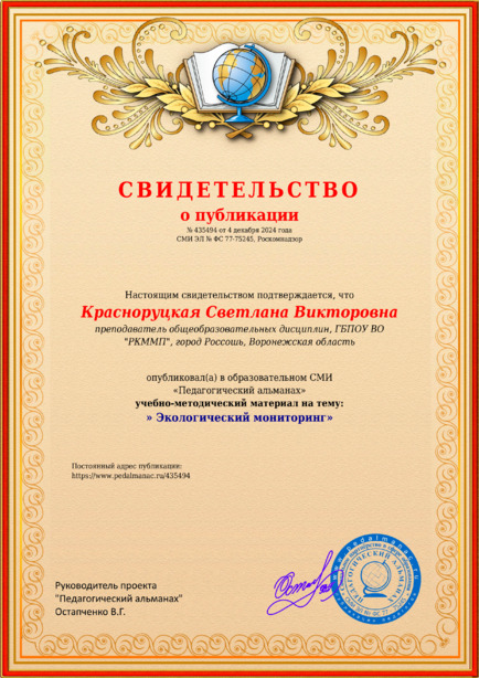 Красноруцкая Светлана Викторовна ” Экологический мониторинг” / С. В. Красноруцкая. – Текст : электронный // Педагогический альманах : электронное СМИ. - URL: https://www.pedalmanac.ru/435494. - Дата публикации: 4 декабря 2024.
