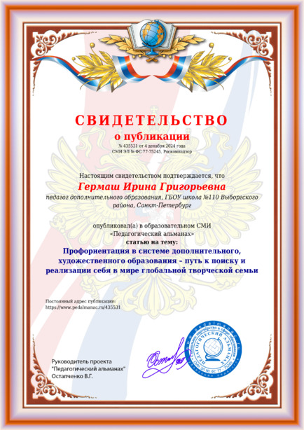 Гермаш, И. Г. Профориентация в системе дополнительного, художественного образования – путь к поиску и реализации себя в мире глобальной творческой семьи [Электронный ресурс] / Ирина Григорьевна Гермаш // Педагогический альманах : [сайт]. - 2024. - 4 декабря. - [Россия]. - Режим доступа: https://www.pedalmanac.ru/435531, свободный. - Загл. с экрана.