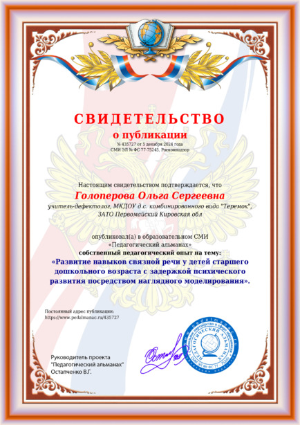 Голоперова Ольга Сергеевна “Развитие навыков связной речи у детей старшего дошкольного возраста с задержкой психического развития посредством наглядного моделирования”. / О. С. Голоперова. – Текст : электронный // Педагогический альманах : электронное СМИ. - URL: https://www.pedalmanac.ru/435727. - Дата публикации: 5 декабря 2024.
