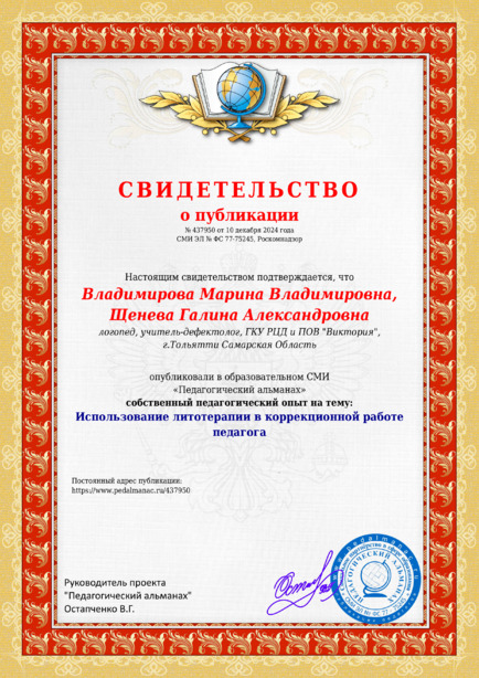 Владимирова Марина Владимировна, Щенева Галина Александровна Использование литотерапии в коррекционной работе педагога / М. В. Владимирова. – Текст : электронный // Педагогический альманах : электронное СМИ. - URL: https://www.pedalmanac.ru/437950. - Дата публикации: 10 декабря 2024.