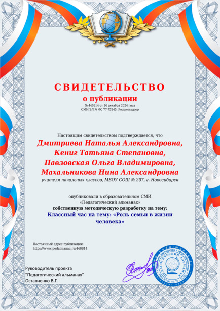 Дмитриева Наталья Александровна, Кениг Татьяна Степановна, Павзовская Ольга Владимировна, Махальникова Нина Александровна Классный час на тему: «Роль семьи в жизни человека» / Н. А. Дмитриева. – Текст : электронный // Педагогический альманах : электронное СМИ. - URL: https://www.pedalmanac.ru/440814. - Дата публикации: 16 декабря 2024.