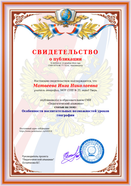 Матвеева Инга Николаевна Особенности воспитательных возможностей уроков географии / И. Н. Матвеева. – Текст : электронный // Педагогический альманах : электронное СМИ. - URL: https://www.pedalmanac.ru/440924. - Дата публикации: 16 декабря 2024.