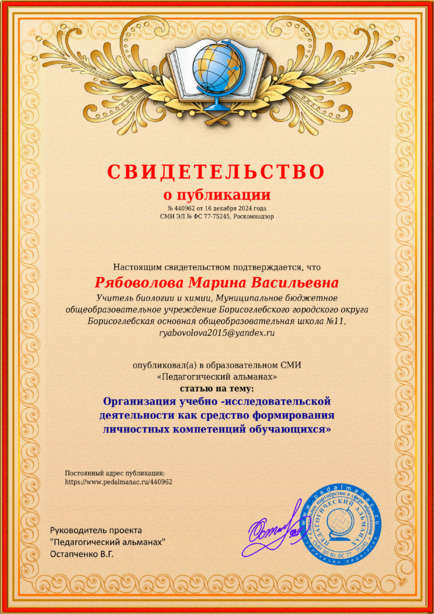 Рябоволова Марина Васильевна Организация учебно -исследовательской деятельности как средство формирования личностных компетенций обучающихся» / М. В. Рябоволова. – Текст : электронный // Педагогический альманах : электронное СМИ. - URL: https://www.pedalmanac.ru/440962. - Дата публикации: 16 декабря 2024.