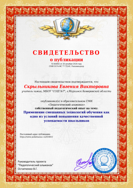Скрыльникова Евгения Викторовна Применение смешанных технологий обучения как одно из условий повышения качественной успеваемости школьников / Е. В. Скрыльникова. – Текст : электронный // Педагогический альманах : электронное СМИ. - URL: https://www.pedalmanac.ru/444843. - Дата публикации: 26 декабря 2024.