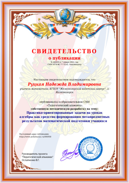 Руцкая Надежда Владимировна Практико-ориентированные задачи на уроках алгебры как средство формирования метапредметных результатов математической подготовки учащихся / Н. В. Руцкая. – Текст : электронный // Педагогический альманах : электронное СМИ. - URL: https://www.pedalmanac.ru/446950. - Дата публикации: 7 января 2025.