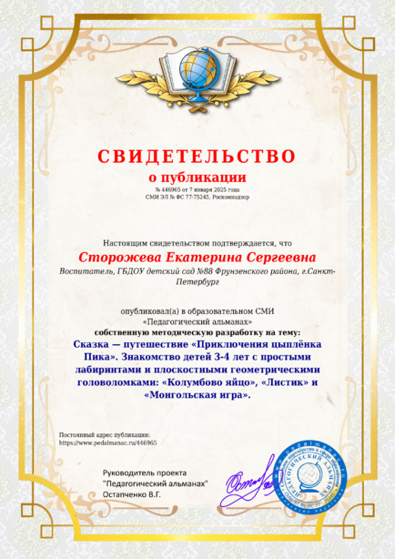 Сторожева Екатерина Сергеевна Сказка – путешествие “Приключения цыплёнка Пика”. Знакомство детей 3-4 лет с простыми лабиринтами и плоскостными геометрическими головоломками: «Колумбово яйцо», «Листик» и «Монгольская игра». / Е. С. Сторожева. – Текст : электронный // Педагогический альманах : электронное СМИ. - URL: https://www.pedalmanac.ru/446965. - Дата публикации: 7 января 2025.