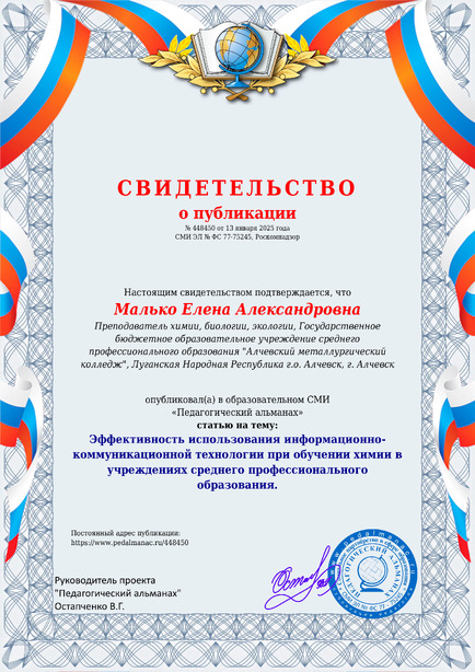 Малько Елена Александровна Эффективность использования информационно-коммуникационной технологии при обучении химии в учреждениях среднего профессионального образования. / Е. А. Малько. – Текст : электронный // Педагогический альманах : электронное СМИ. - URL: https://www.pedalmanac.ru/448450. - Дата публикации: 13 января 2025.