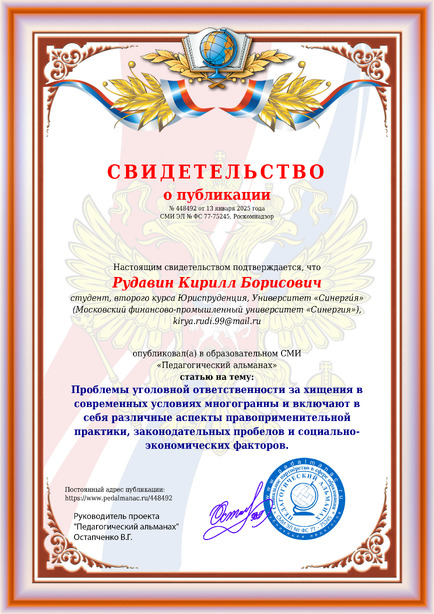 Рудавин Кирилл Борисович Проблемы уголовной ответственности за хищения в современных условиях многогранны и включают в себя различные аспекты правоприменительной практики, законодательных пробелов и социально-экономических факторов. / К. Б. Рудавин. – Текст : электронный // Педагогический альманах : электронное СМИ. - URL: https://www.pedalmanac.ru/448492. - Дата публикации: 13 января 2025.