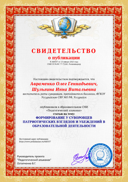 Авраменко Олег Геннадьевич, Шульгина Инна Витальевна ФОРМИРОВАНИЕ У СУВОРОВЦЕВ ПАТРИОТИЧЕСКИХ ВЗГЛЯДОВ И УБЕЖДЕНИЙ В ОБРАЗОВАТЕЛЬНОЙ ДЕЯТЕЛЬНОСТИ / О. Г. Авраменко. – Текст : электронный // Педагогический альманах : электронное СМИ. - URL: https://www.pedalmanac.ru/448507. - Дата публикации: 13 января 2025.