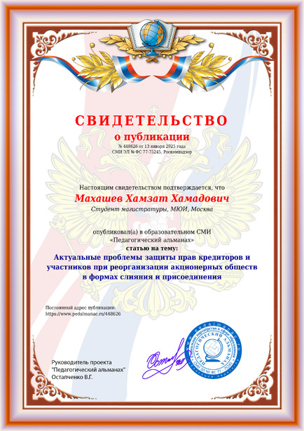 Махашев Хамзат Хамадович Актуальные проблемы защиты прав кредиторов и участников при реорганизации акционерных обществ в формах слияния и присоединения / Х. Х. Махашев. – Текст : электронный // Педагогический альманах : электронное СМИ. - URL: https://www.pedalmanac.ru/448626. - Дата публикации: 13 января 2025.