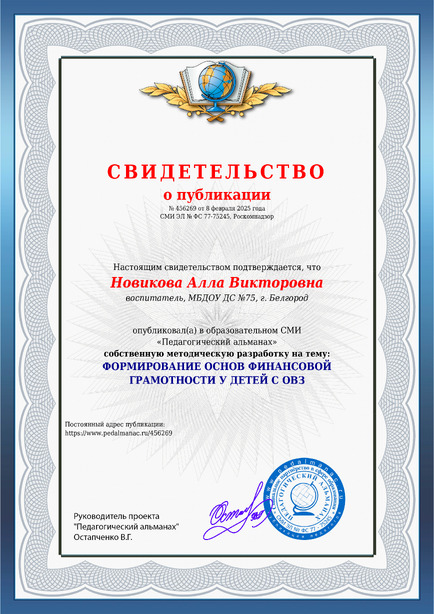 Новикова Алла Викторовна ФОРМИРОВАНИЕ ОСНОВ ФИНАНСОВОЙ ГРАМОТНОСТИ У ДЕТЕЙ С ОВЗ / А. В. Новикова. – Текст : электронный // Педагогический альманах : электронное СМИ. - URL: https://www.pedalmanac.ru/456269. - Дата публикации: 8 февраля 2025.