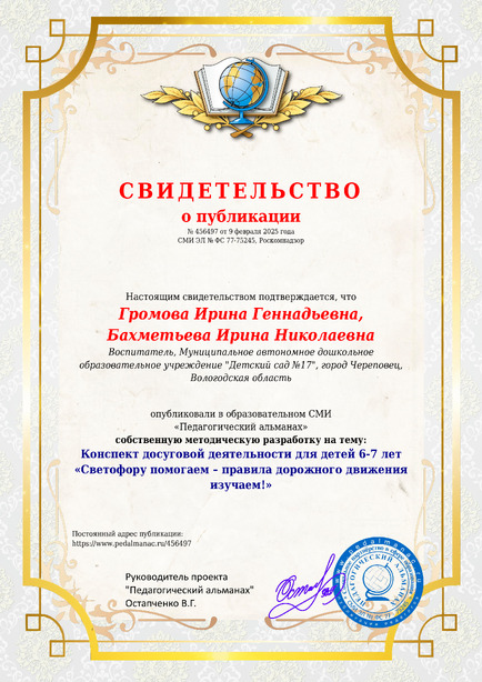 Громова Ирина Геннадьевна, Бахметьева Ирина Николаевна Конспект досуговой деятельности для детей 6-7 лет «Светофору помогаем – правила дорожного движения изучаем!» / И. Г. Громова. – Текст : электронный // Педагогический альманах : электронное СМИ. - URL: https://www.pedalmanac.ru/456497. - Дата публикации: 9 февраля 2025.