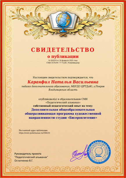 Каранфил Наталья Васильевна Дополнительная общеобразовательная общеразвивающая программа художественной направленности студии «Бисероплетение» / Н. В. Каранфил. – Текст : электронный // Педагогический альманах : электронное СМИ. - URL: https://www.pedalmanac.ru/458214. - Дата публикации: 16 февраля 2025.