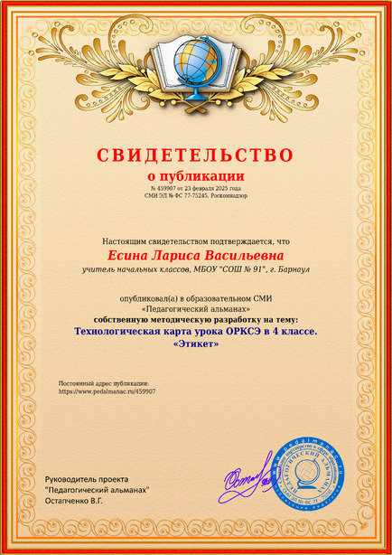 Есина, Л. В. Технологическая карта урока ОРКСЭ в 4 классе. “Этикет” [Электронный ресурс] / Лариса Васильевна Есина // Педагогический альманах : [сайт]. - 2025. - 23 февраля. - [Россия]. - Режим доступа: https://www.pedalmanac.ru/459907, свободный. - Загл. с экрана.